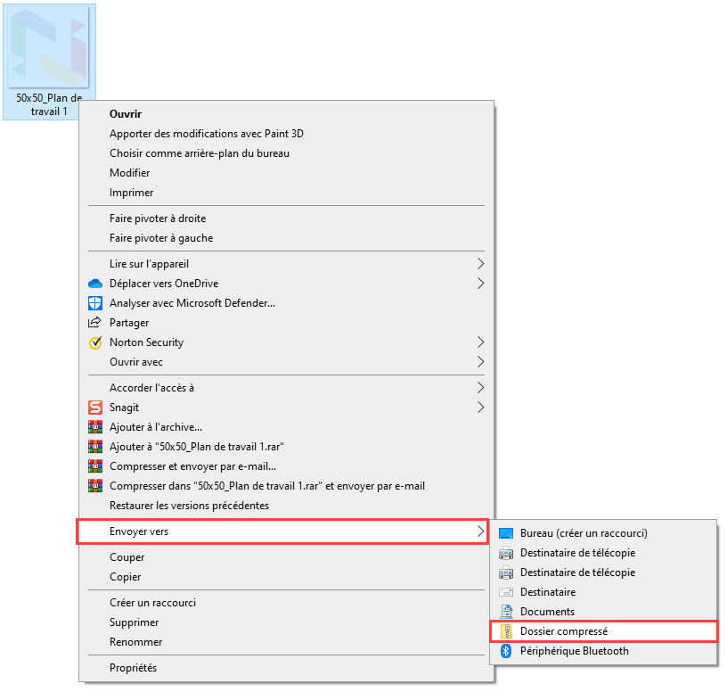 Pour compresser vos fichiers, faites un clic droit sur le fichier demandé puis Envoyer vers > Dossier compressé.