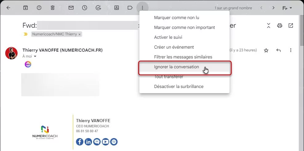 Sur le bureau, cochez la case à gauche de votre message dans votre boîte de réception, cliquez sur le menu à trois points en haut de la page et sélectionnez Ignorer la conversation.