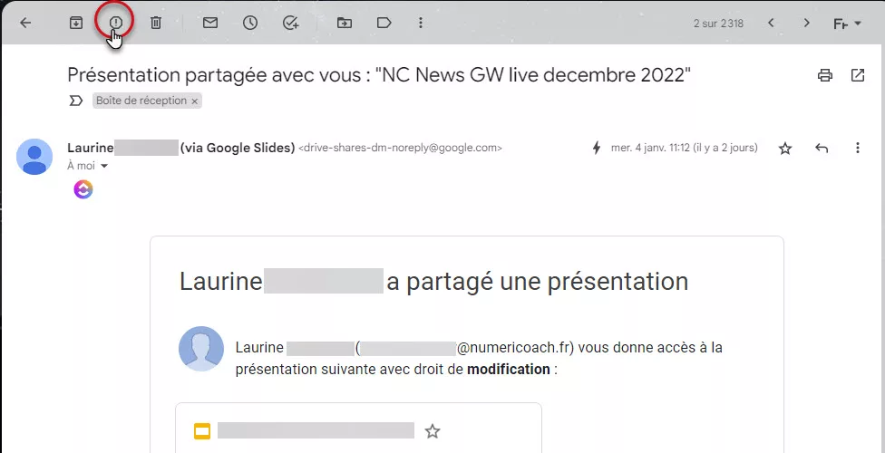 Gmail protège automatiquement votre boîte de réception des spams et des e-mails indésirables grâce à l’intelligence artificielle. Gmail protège les utilisateurs contre près de 15 milliards de messages indésirables par jour, bloquant plus de 99,9 % des spams, du phishing et des logiciels malveillants. Mais si un message apparaît et dépasse les filtres, vous pouvez le signaler comme spam en cochant la case à côté de votre message, puis en cliquant sur l’icône Signaler comme spam. (Si vous êtes déjà dans le message, il vous suffit d’un clic sur le bouton Signaler un spam et vous êtes prêt).