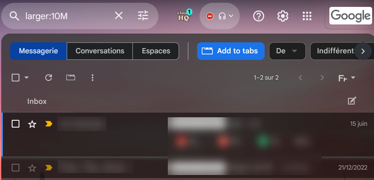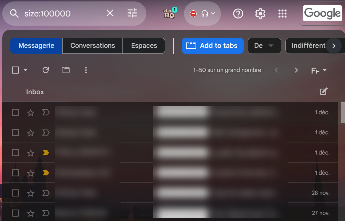 Vous pouvez aussi utiliser le filtre “size:” pour afficher les e-mails dont le poids est supérieur à un certain nombre d’octets. Par exemple “size:100000”.